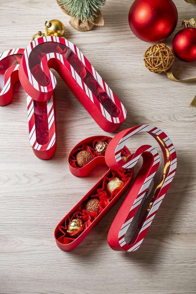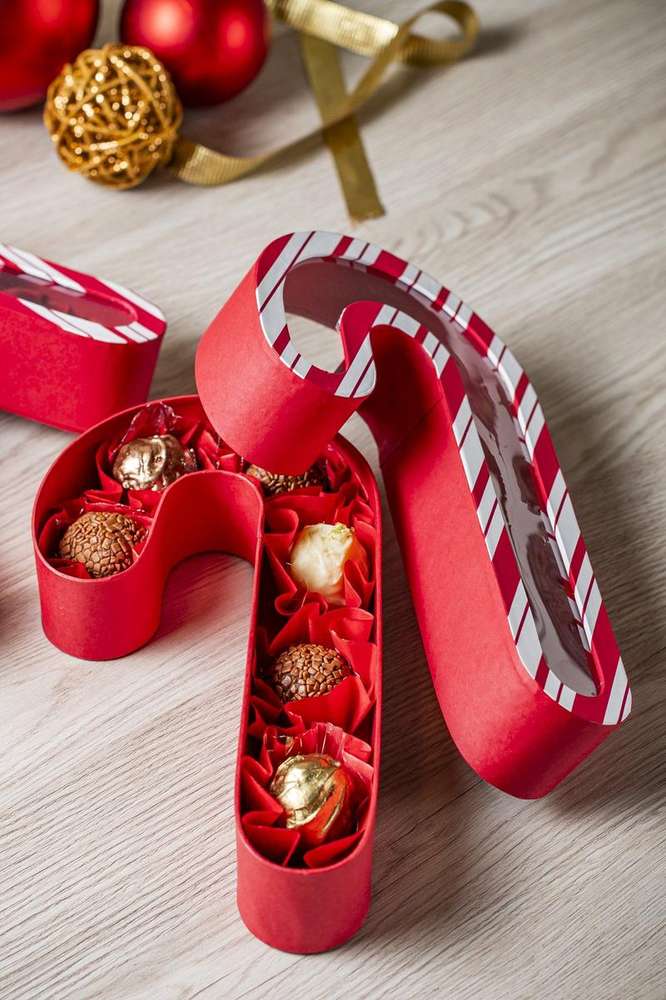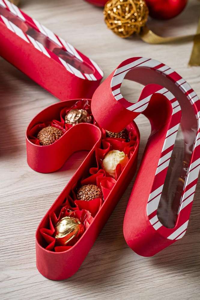 Charmosa bengala natalina recheada com brigadeiros e trufas sortidas. Presente criativo e delicioso.