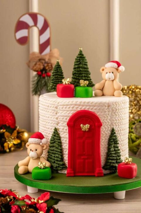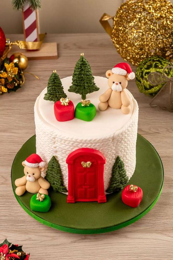 Bolo decorado em pasta americana com ursinhos natalinos. Design encantador. Sabores sob consulta. Serve 15 pessoas.