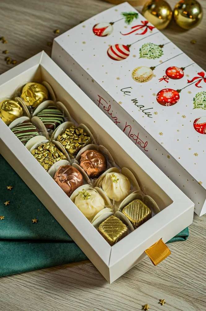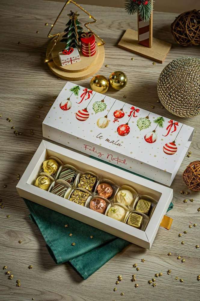 Torrones de amêndoas e pistache, trufas de limão siciliano, chocolate belga, framboesa e nutella crocante.