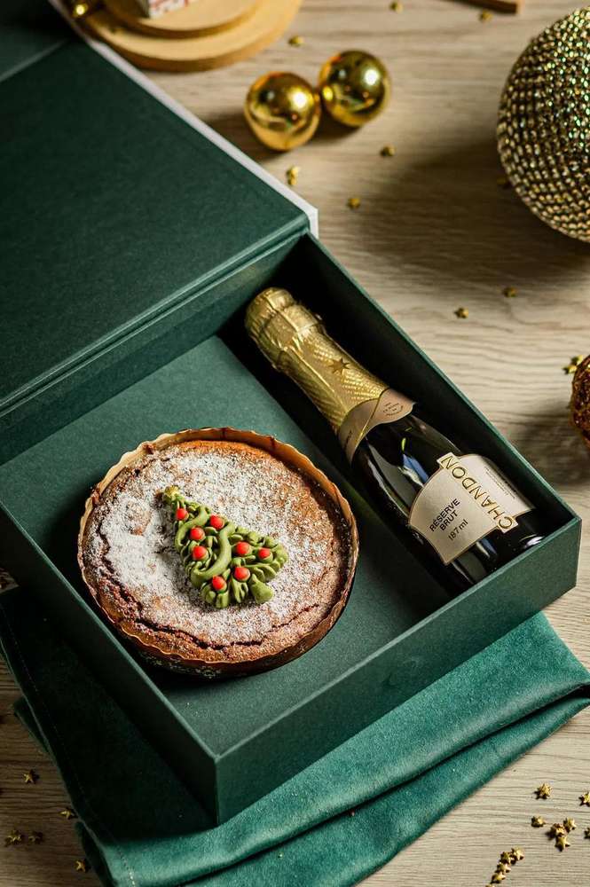 Brownie artesanal com nozes (290g) acompanhado de Mini Chandon 187ml. Apresentação premium em caixa verde.