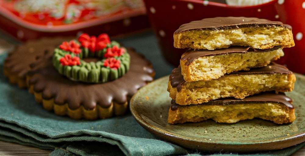 6 bolachas artesanais de baunilha com cobertura de chocolate, decoradas com motivos natalinos. Lata reutilizável.