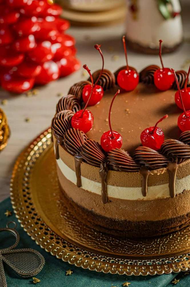Pão de ló de chocolate com mousses de chocolate, chocolate branco e gianduia, ganache e cerejas chilenas. Serve 10 pessoas.