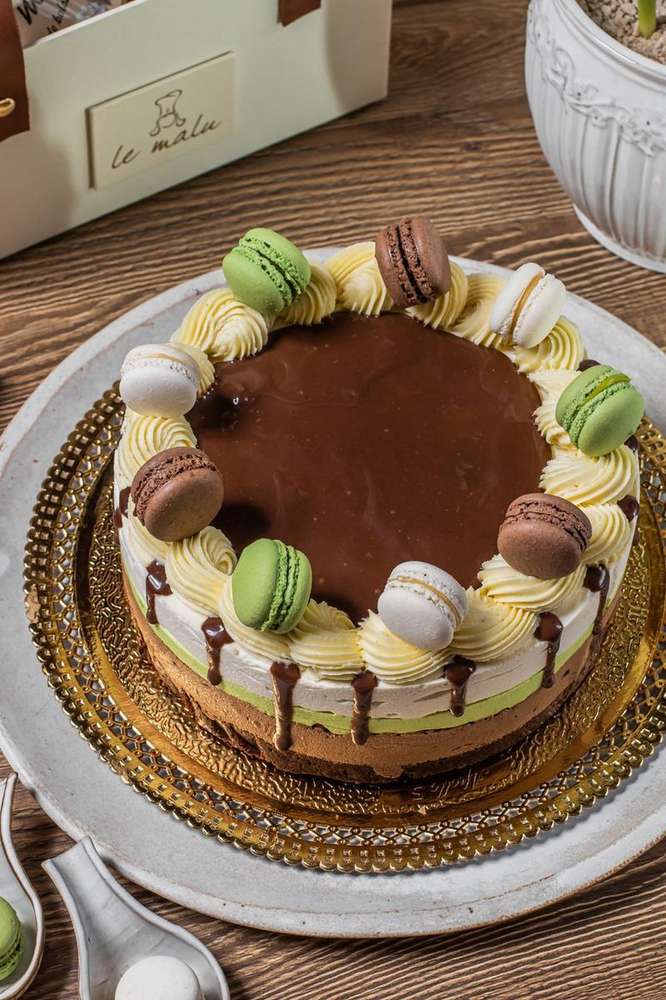Pão de ló de chocolate com mousses de chocolate, chocolate branco e pistache, ganache de cheesecake e macarons. Serve 15-18 pessoas.